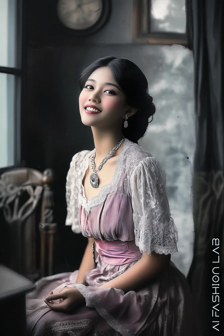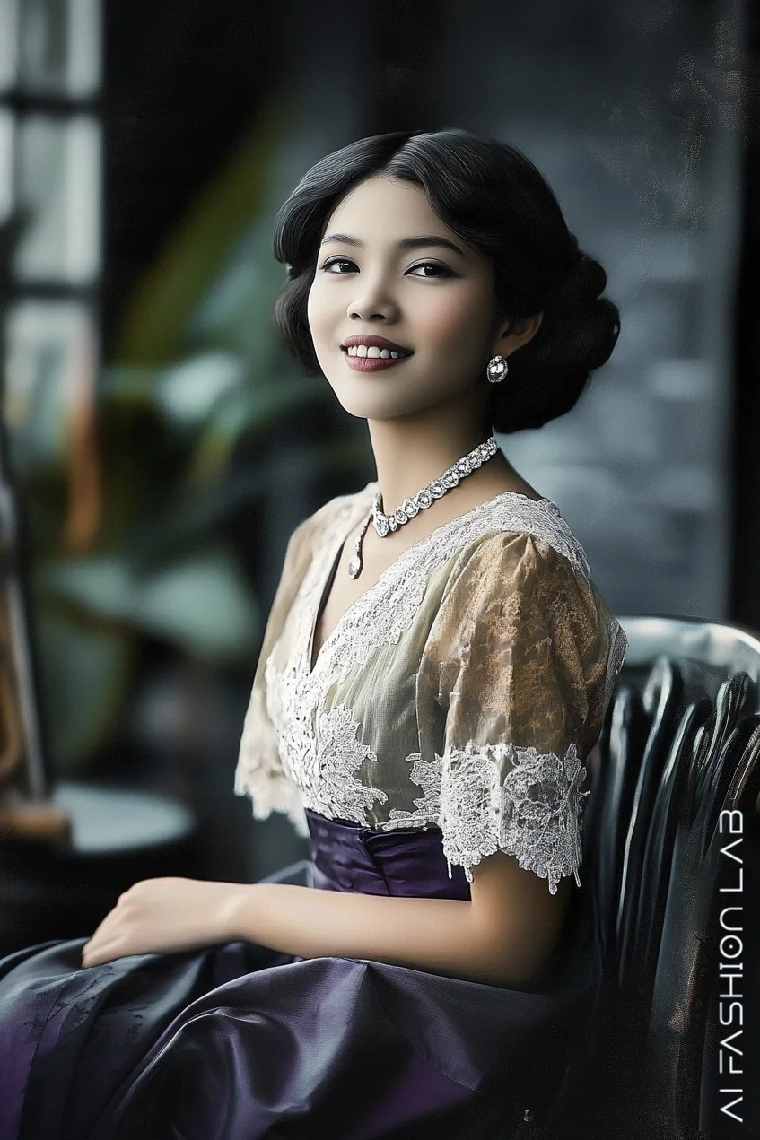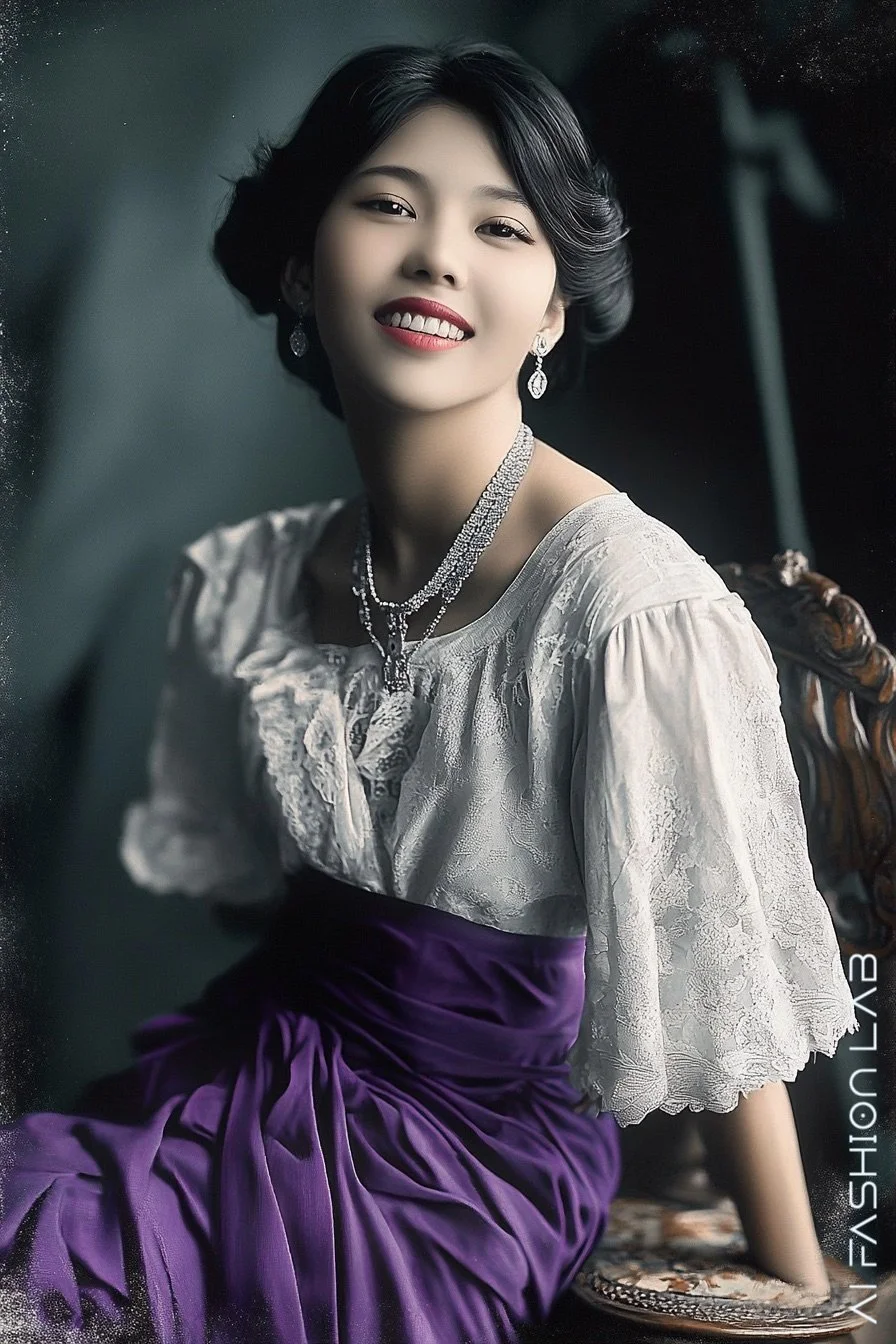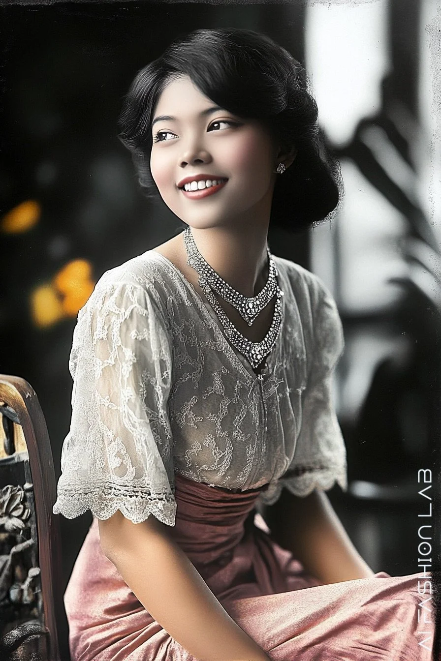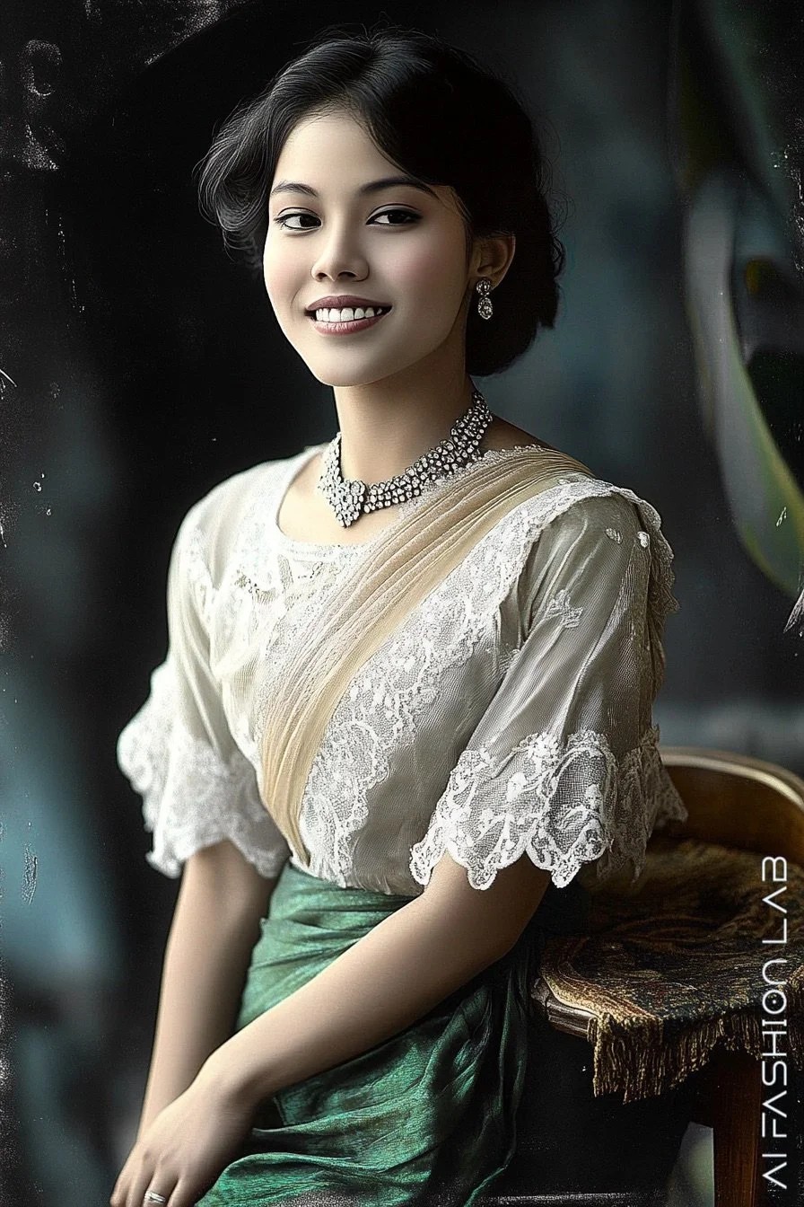 During the late reign of King Chulalongkorn, Siam experienced a cultural transformation, particularly in fashion, as it sought to modernise and engage with the Western world. The royal court, especially the all-female inner court, began to incorporate Western dress elements, blending them with traditional Thai styles to create a unique identity for Siamese aristocracy. Influenced by Edwardian elegance, these women might have worn delicate lace gowns, high-waisted skirts, and upswept hairstyles, mirroring the sophistication of European nobility while maintaining Siamese grace and refinement.