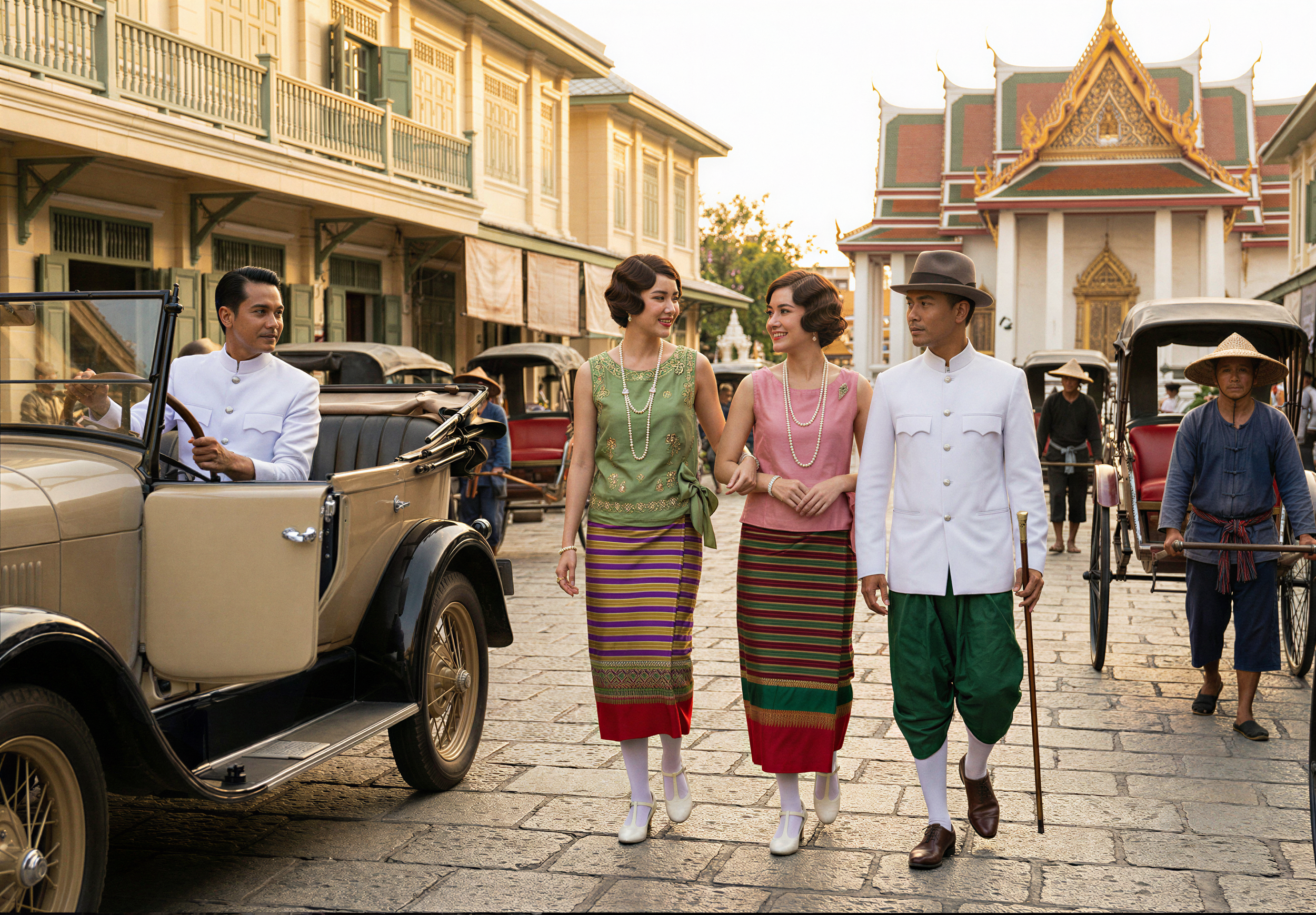 The clothing details are equally meticulous. Women wear sleeveless silk blouses embroidered with floral motifs in shades of green, lychee pink, rose, and deep blue, paired with gold-threaded sin tian chok or striped silk skirts. Ivory stockings and Mary Jane shoes complete the contemporary 1920s look. Men wear immaculate white rajpattern jackets with silk jongkraben in green, blue, or purple, complemented by Western-influenced fedoras or boater hats—an elegant testament to the sartorial tastes of Siam’s upper class before the Second World War.