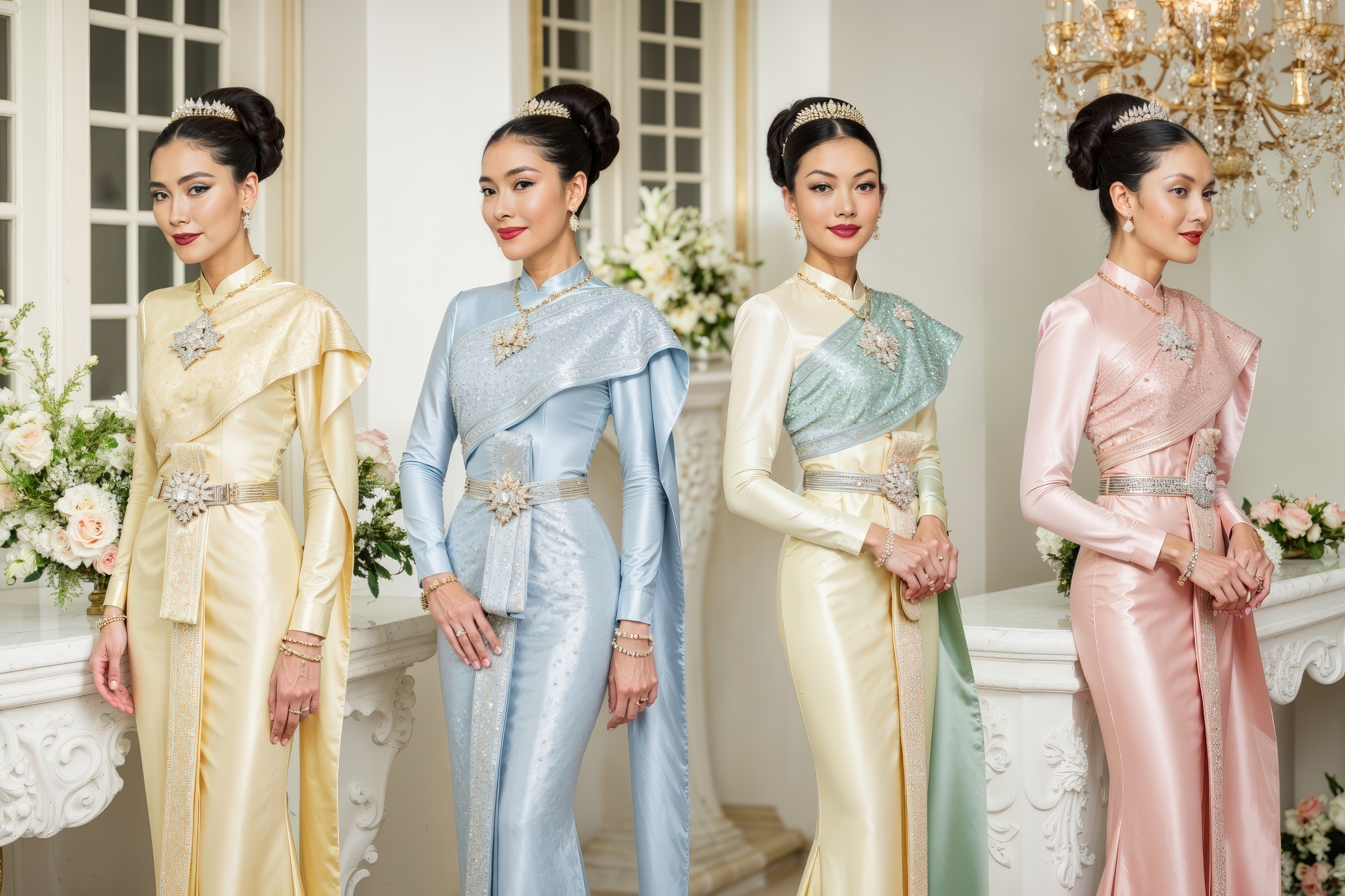For this AI Collection, I designed each Chud Thai Siwalai (ชุดไทยศิวาลัย) using silver-threaded silk in soft pastel tones throughout the collection. Each look is adorned with traditional Thai jewellery, including antique-style diamond sets, small Western-style tiaras or crowns, to highlight the sweetness, gentleness, and grace of the wearer. These designs are ideal for formal evening occasions such as weddings, royal receptions, or gala events.