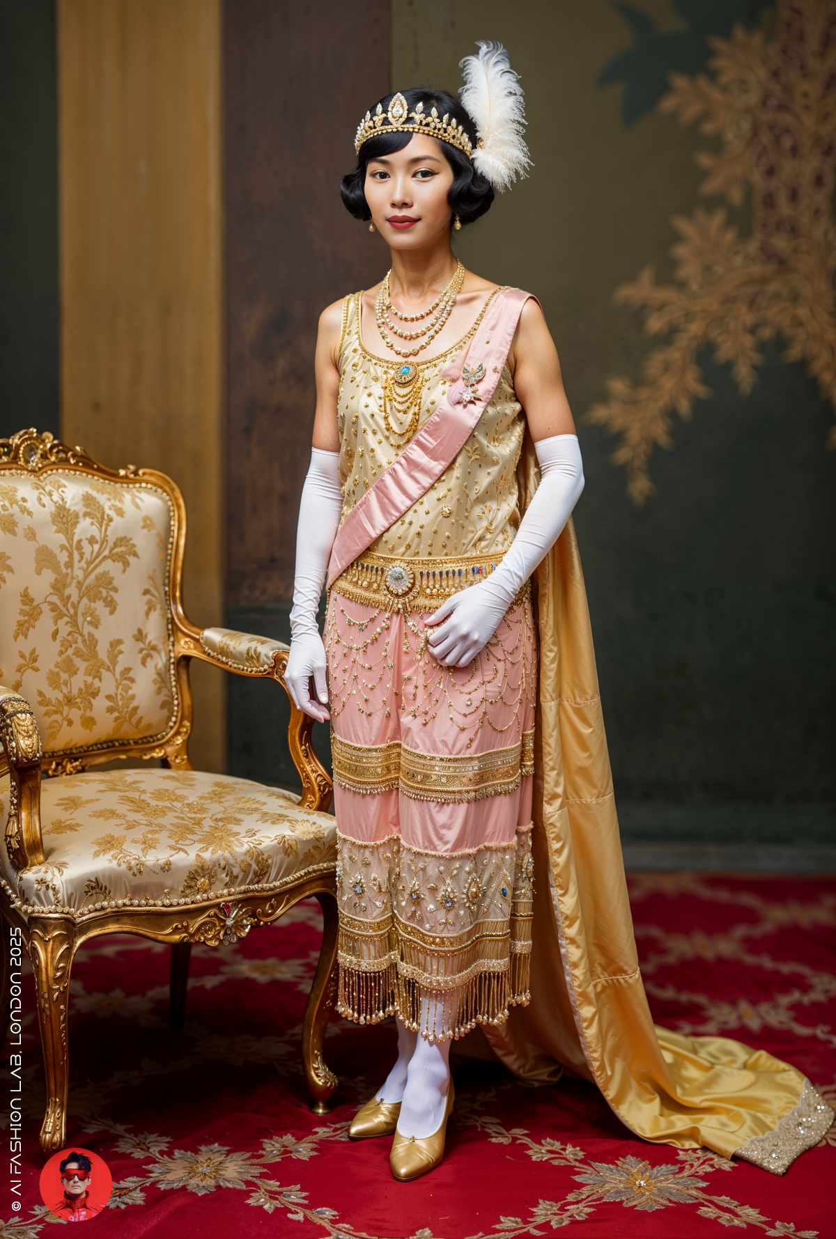 This image collection was created by training a LoRA-based AI model using black-and-white photographs from London during the 1920s, which were colourised and restored to serve as the dataset for the base model of British court ceremonial dress. This was then blended with another model representing Thai women's fashion from the same era, particularly focusing on the silhouette and styling of the pha-sin as worn in the royal court. The blending process involved carefully adjusting the weight of each model, which proved crucial in generating a distinctive hybrid visual identity—an artistic fusion of Western court traditions with Thai cultural aesthetics.