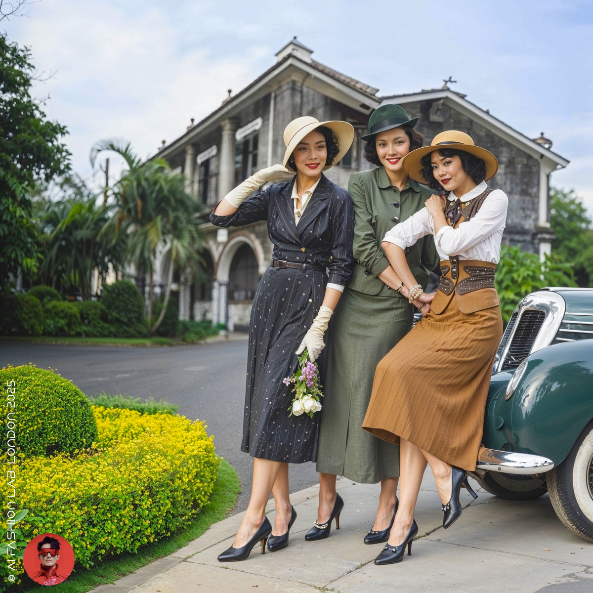 Set in an imagined 1930s Bangkok, the women of Siam in this AI-generated collection wear Western-style clothing with grace and refinement. These styles reflect the influence of British interwar fashion—particularly the women’s day suit, a hallmark of modernity and sophistication among the upper classes.