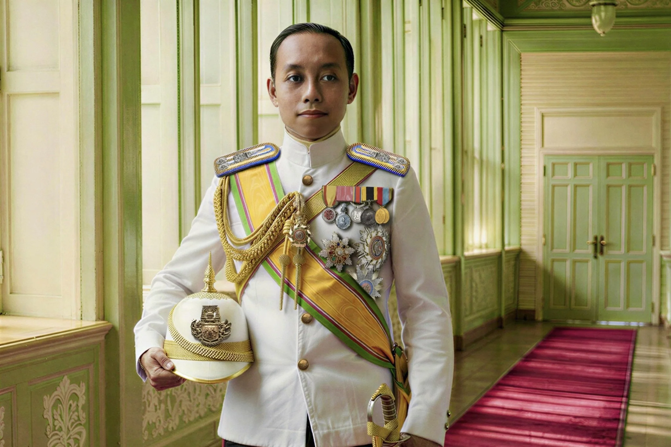 To provide contemporary visual context for the Royal Pages’ Guards Full Dress White Uniform, reference is made to the royal portrait of King Maha Vajiralongkorn (พระบาทสมเด็จพระวชิรเกล้าเจ้าอยู่หัว), taken when He was serving as Crown Prince of Thailand (สมเด็จพระบรมโอรสาธิราชฯ สยามมกุฎราชกุมาร).