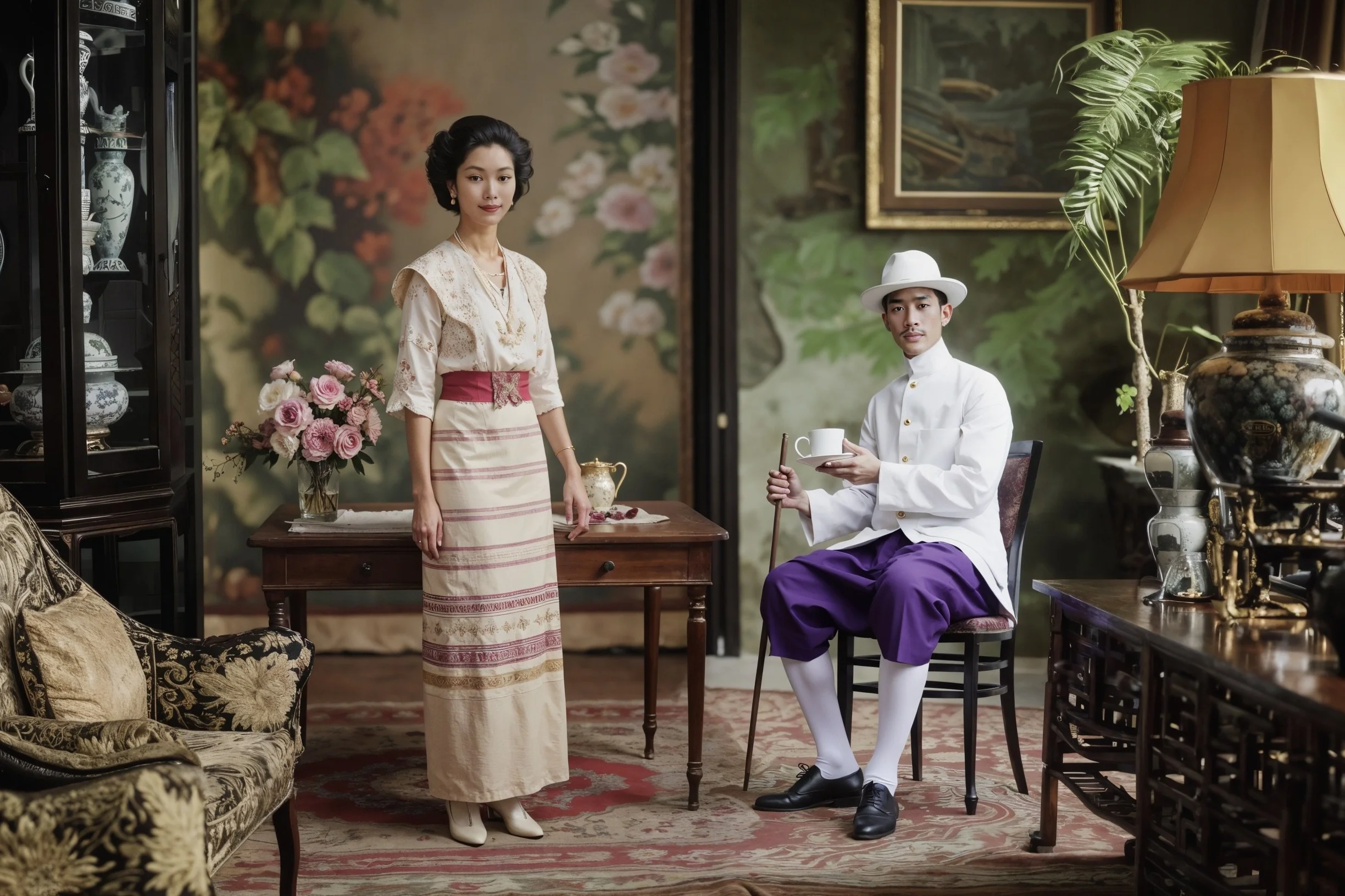 In late Edwardian fashion, fabrics were light, sheer, and often draped to create a flowing silhouette. Skirts became narrower and longer, adorned with lace, pearls, and floral embellishments. In Lanna, the distinctive sinh (tube skirt) remained central to women’s attire, typically paired with lace or silk blouses that incorporated European-style details. These AI-enhanced images, generated through LoRA model training on period fashion silhouettes, reflect the upper garments’ distinctively late Edwardian and early Teens styles, even if regional textile patterns of the sinh, such as sin tamotifs, may not be fully represented.
