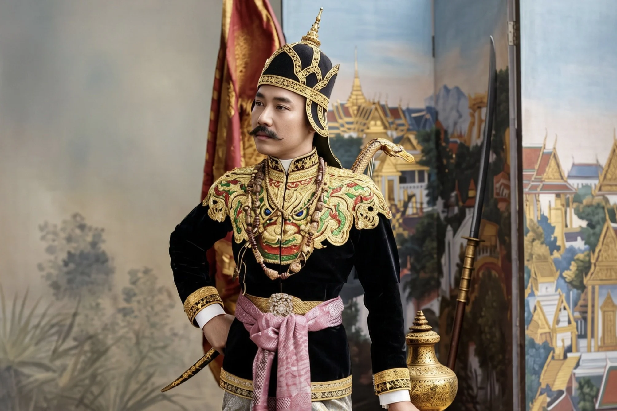 This AI-restored and AI-created image depicts His Royal Highness Prince Bhanurangsi Savangwongse, Prince Bhanubandhu Vongsevoradej (สมเด็จพระราชปิตุลาบรมพงศาภิมุข เจ้าฟ้าภาณุรังษีสว่างวงศ์ กรมพระยาภาณุพันธุวงศ์วรเดช), also known informally as Somdet Wang Burapha (สมเด็จวังบูรพา). In this image, he is represented in the attire of an old Siamese nobleman, wearing a ceremonial upper garment adorned with an embroidered neck armour or kro kho (เกราะคอ), decorated with a na khop (หน้าขบ) motif developed from ornamental designs associated with Chinese armour.