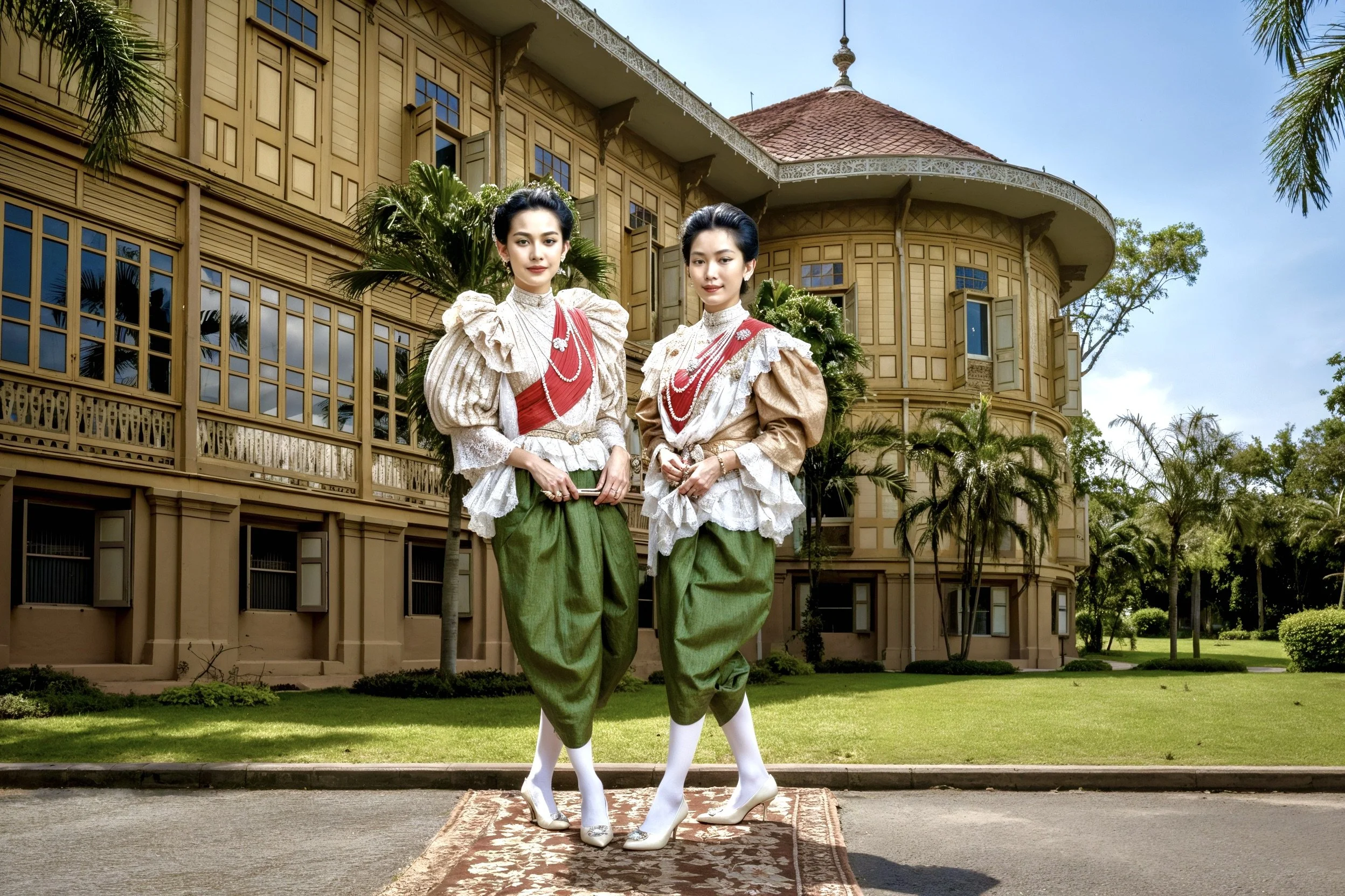 This AI-generated image is an artistic imagination of court fashion in the Inner Palace during the late reign of King Chulalongkorn (Rama V), circa the 1890s (BE 2430–2440). It envisions the style of the period when the leg-of-mutton sleeve blouse became highly fashionable among ladies of the Siamese court. The design here is created in harmony with the Sunday auspicious colour pairing according to the traditional Sawasdiraksa system: “Nung Kam-Poo, Hom Din-Daeng Thet” (red upper garment, green lower garment), and is imagined as attire within the Vimarnmek Mansion.
