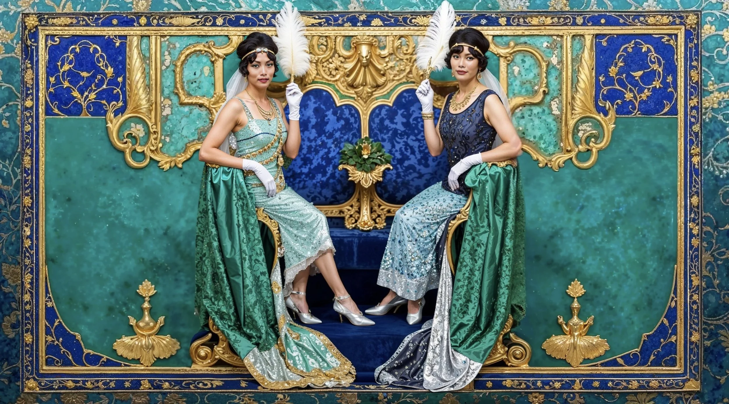 In this fashion series, cloisonné becomes not only an accessory motif but a design philosophy. Bracelets, brooches, belts, and headpieces echo the cloisonné technique through intricate metalwork and richly layered enamel tones. These elements are stylised with Art Deco symmetry, geometric arrangements, and floral lines—lotus blooms, trailing vines, and the unmistakable silhouette of the peacock, a timeless emblem of Eastern opulence. However, as the collection is set in the early 1920s, there are also clear Art Nouveau influences: fluid curves, whiplash lines, and organic motifs soften the sharp edges of Deco formality, adding a sense of lyrical movement and natural grace.