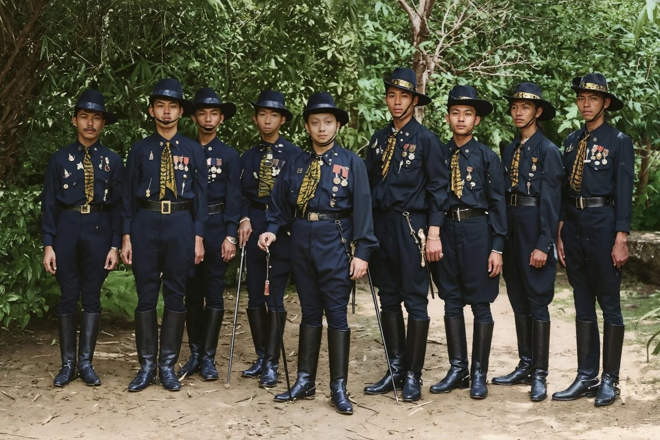 ภาพที่สร้างสรรค์ด้วยเทคโนโลยี AI ชุดนี้ เป็นภาพของกองเสือป่า (Wild Tiger Corps) ซึ่งก่อตั้งขึ้นเมื่อวันที่ 1 พฤษภาคม พ.ศ. 2454 ในรัชสมัยพระบาทสมเด็จพระมงกุฎเกล้าเจ้าอยู่หัว (รัชกาลที่ 6) โดยมีพระราชประสงค์ให้ข้าราชการและประชาชนทั่วไปได้ฝึกวิชาทหารเพื่อเป็นกำลังสำรองในยามสงคราม อีกทั้งยังเป็นหนทางให้ผู้คนใกล้ชิดพระองค์และมีโอกาสรับใช้โดยตรง พระองค์ทรงเป็น “เสือป่า หมายเลข 1” และดำรงตำแหน่งนายกองใหญ่ (Captain-General) ด้วยพระองค์เอง แสดงถึงพระราชศรัทธาและความเอาพระทัยใส่ในกิจการนี้อย่างแท้จริง