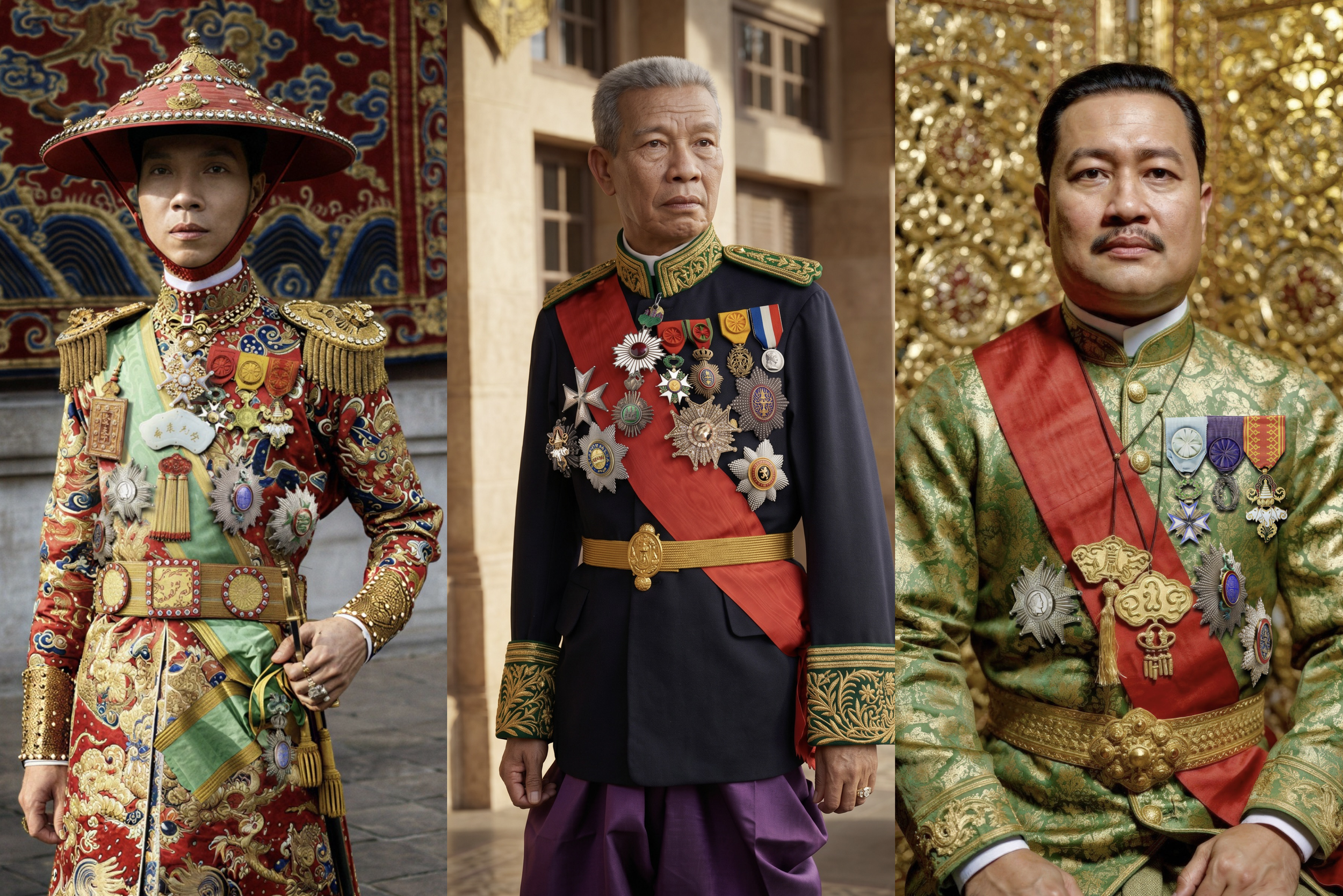 ภาพที่ได้รับการบูรณะและสร้างสรรค์ขึ้นด้วยเทคโนโลยี AI ในคอลเลกชันนี้ เป็นพระบรมฉายาลักษณ์ของกษัตริย์ ๓ พระองค์ แห่งจักรวรรดิ อินโดจีนของฝรั่งเศส (French Indochina) · พ.ศ. ๒๔๕๙–๒๔๖๘ : สมเด็จพระจักรพรรดิขาย ดิ่ญ (Khải Định : 啟定) แห่งอันนัม, พระเจ้าสีสุวัตถิ์ (ព្រះបាទស៊ីសុវតិ្ថ : Sisowath) แห่งพระราชอาณาจักรกัมพูชา,และ พระเจ้าสีสว่างวงศ์ (ສີສວ່າງວົງ — Sisavang Vong) แห่งราชอาณาจักรล้านช้างหลวงพระบาง และพระมหากษัตริย์พระองค์แรกแห่งพระราชอาณาจักรลาว